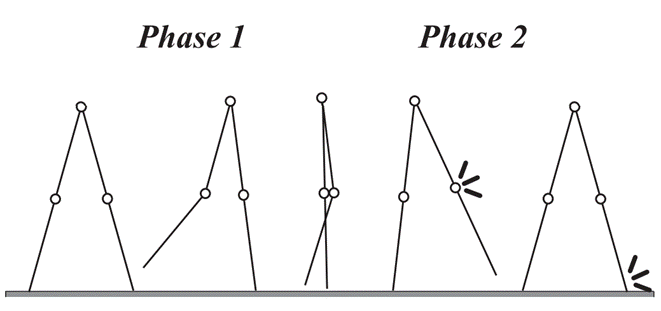 - 图9-7为一个周期的运动阶段示意图:左侧Phase1为髋、膝、踝等关节连接示意图,右侧Phase2为对应的电机等效电路模型,明确能耗计算的物理载体;