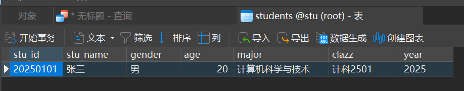 (20250101,'张三','男',20,'计算机科学与技术','计科2501',2025)