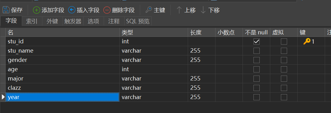 `year` bigint(20) DEFAULT NULL COMMENT '入学年份'