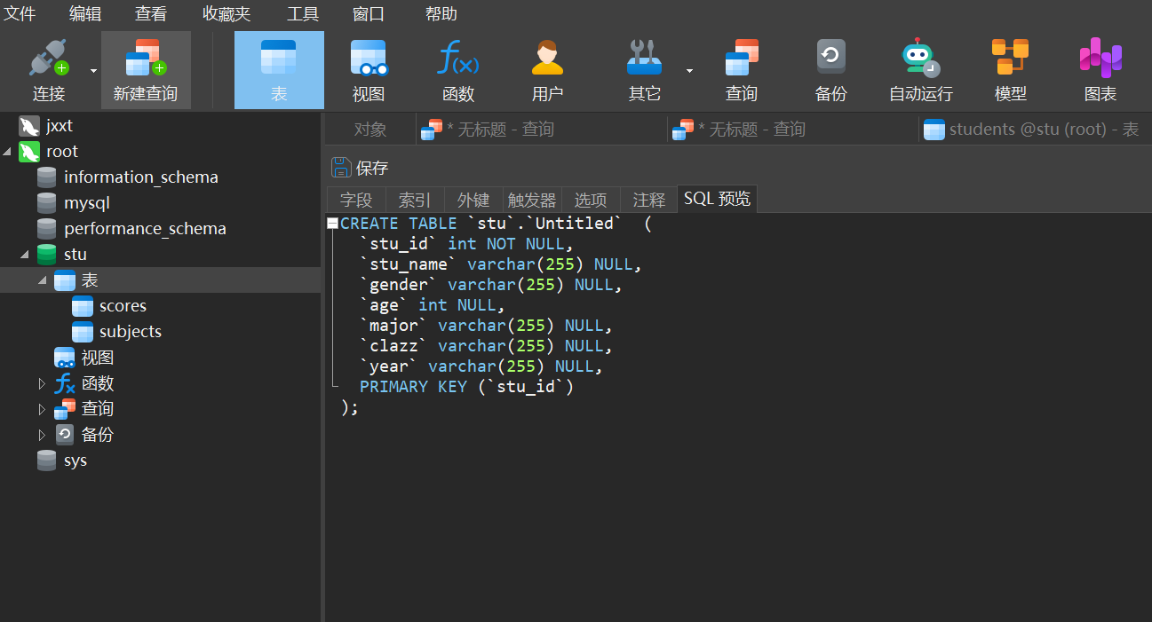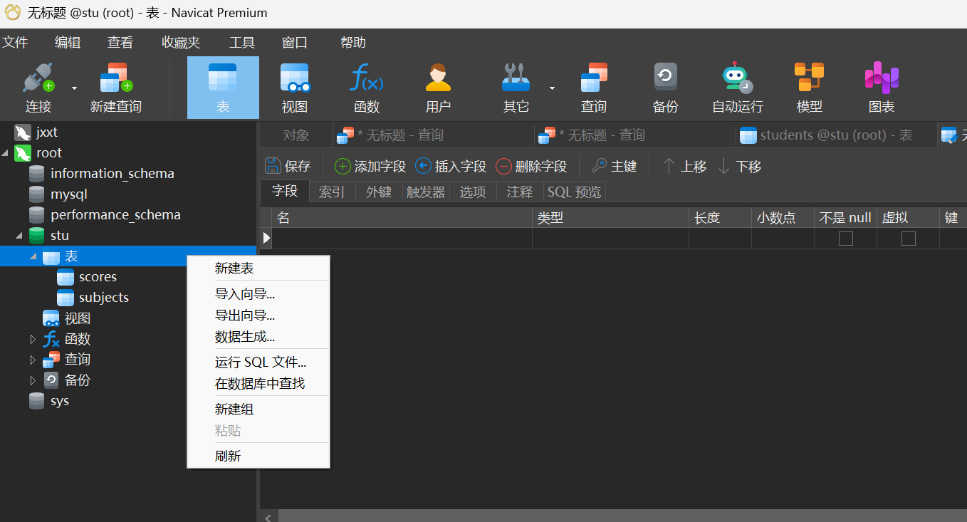 创建好数据库以后,右击表 弹出提示框点击新建表