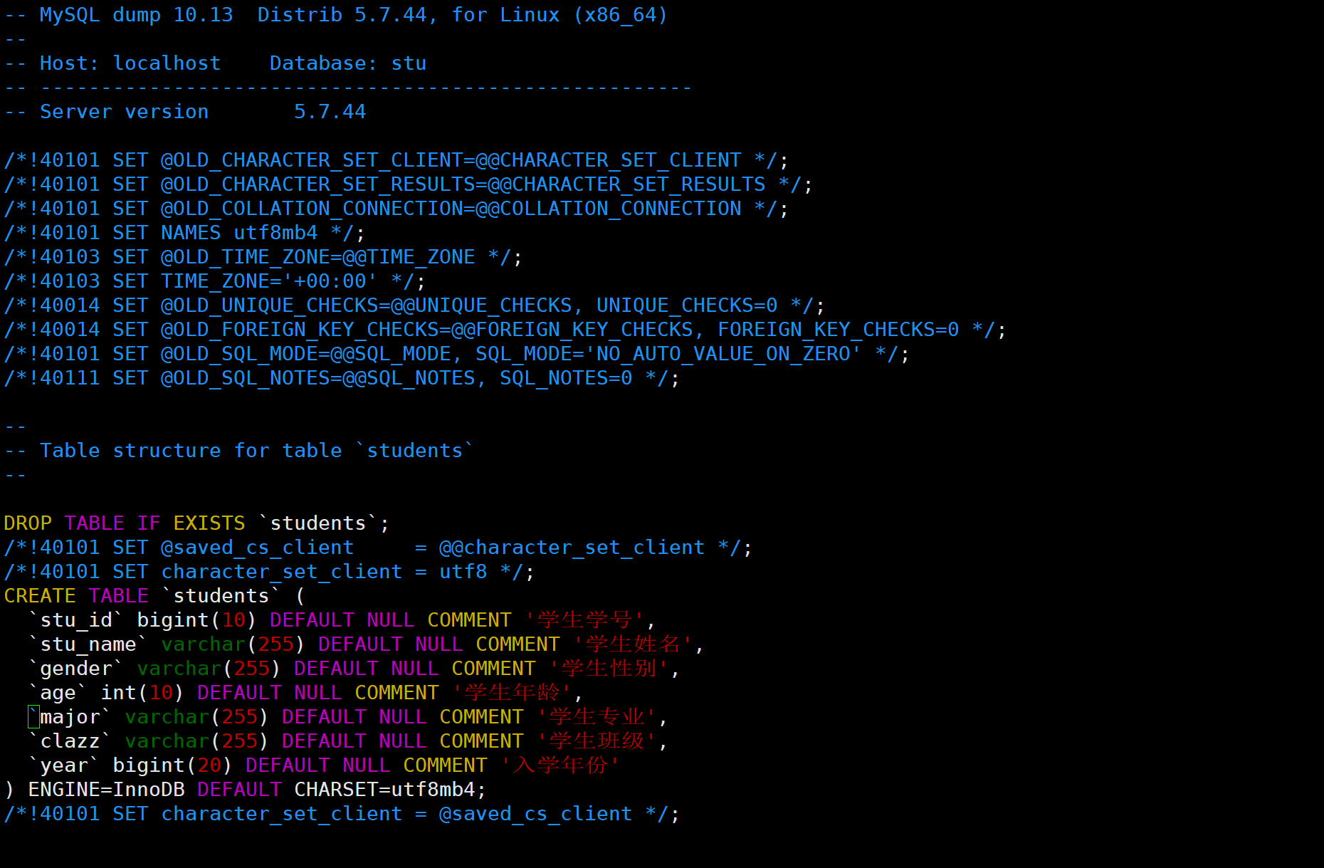 mysqldump -uroot -p stu students > /root/data/students.sql