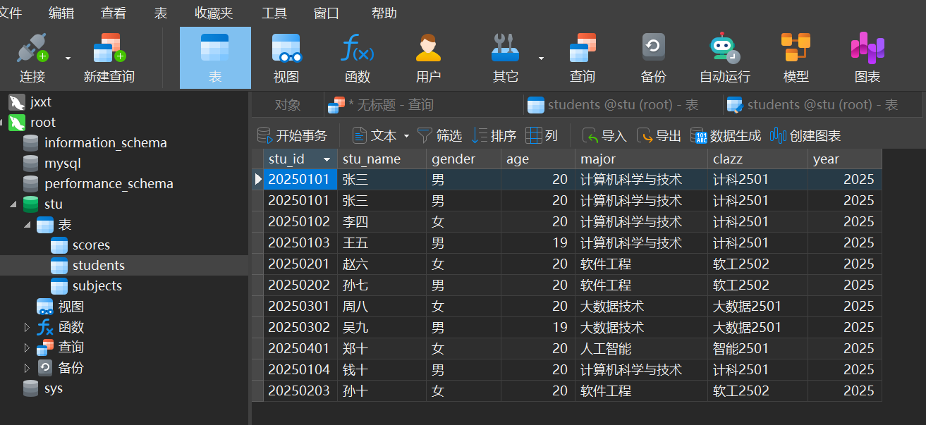 ,(20250201,'赵六','女',20,'软件工程','软工2502',2025)