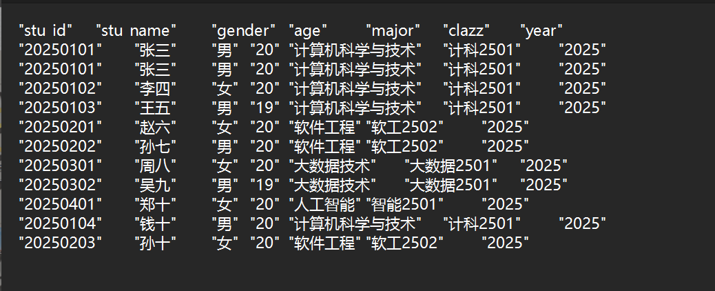 ,(20250301,'周八','女',20,'大数据技术','大数据2501',2025)
