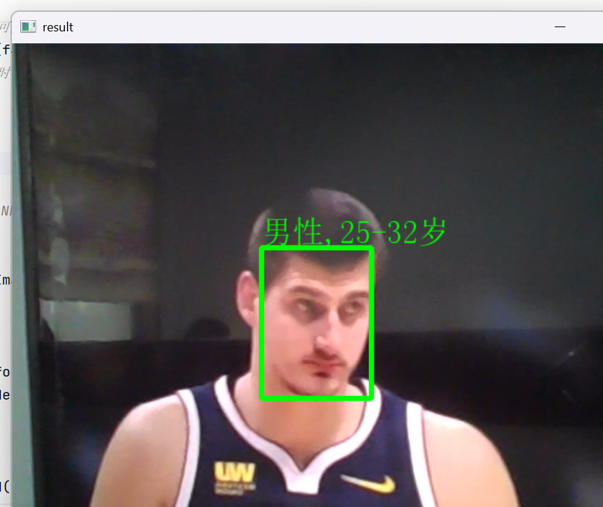 net.setInput()设置输入,net.forward()执行前向传播,最终得到预测结果,再对结果进行解析,输出我们需要的信息(本次为性别和年龄)。