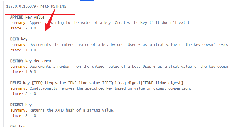 help <group>这是用来查看某一类命令的完整列表。你需要把<group>替换成 Redis 的命令组名称,比如string、list、set。举个例子,输入help string就能看到所有和字符串相关的命令。