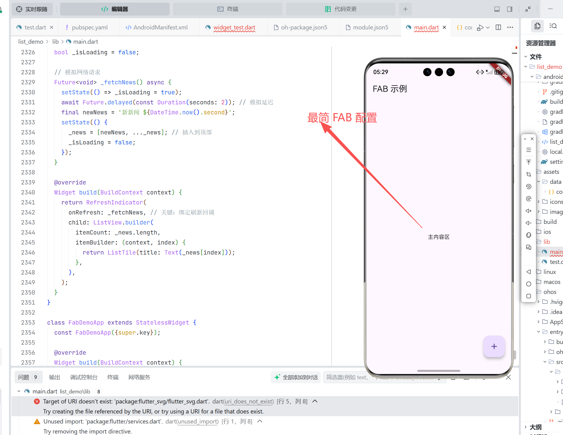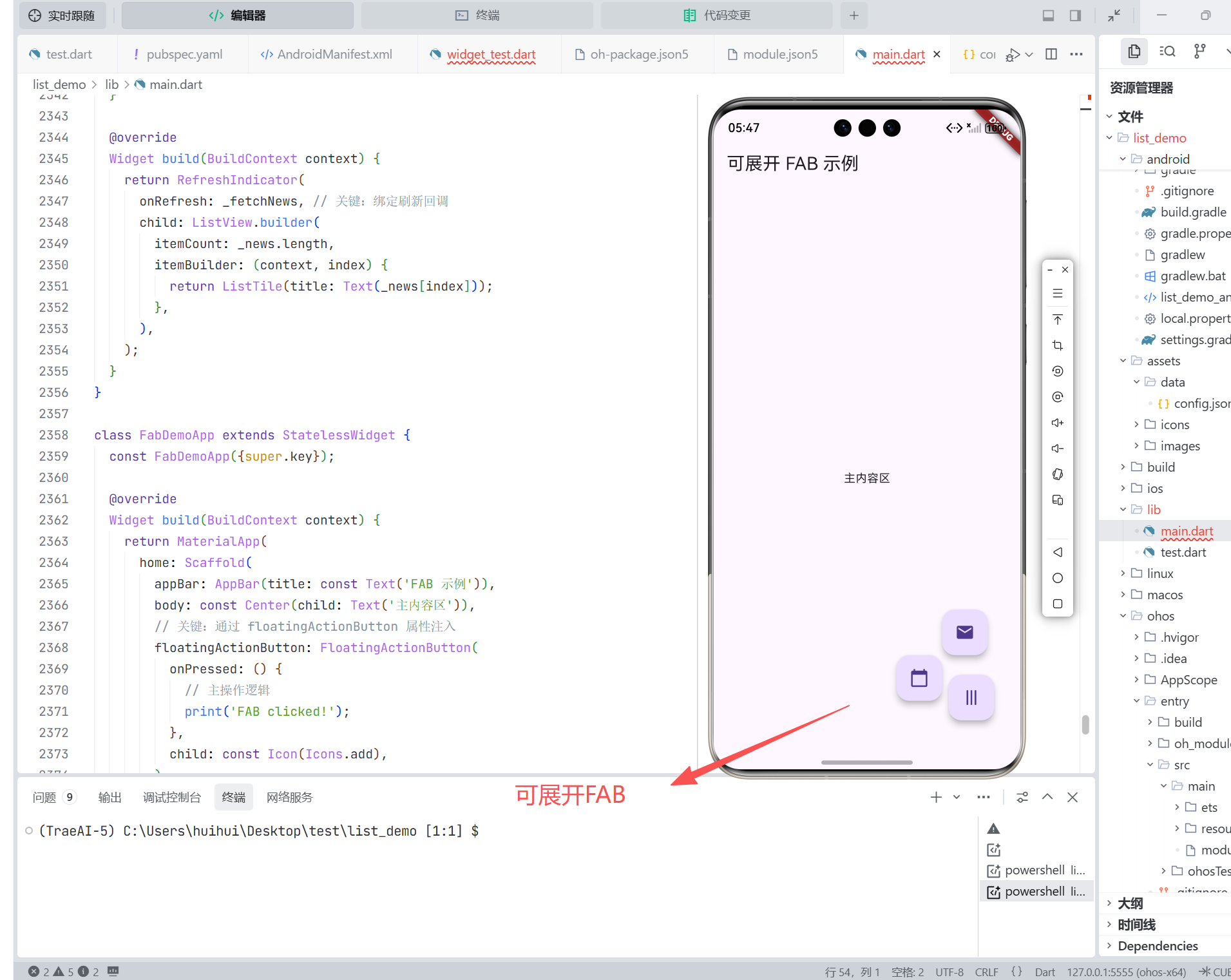 在 Flutter for OpenHarmony 开发中,FloatingActionButton(简称 FAB)不仅开箱即用,还支持高度定制与扩展。更重要的是,由于其完全由 Dart 实现,FAB 在 OpenHarmony 设备上表现稳定、动画流畅,且能智能避开系统安全区域(如刘海屏、挖孔屏),无需额外适配。