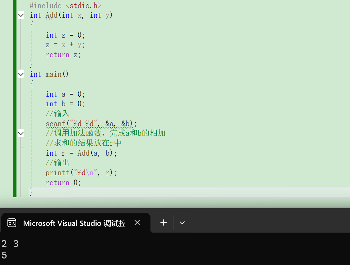 cs#include <stdio.h> int Add(int x, int y) { int z = 0; z = x+y; return z; } int main() { int a = 0; int b = 0; //输⼊ scanf("%d %d", &a, &b); //调⽤加法函数,完成a和b的相加 //求和的结果放在r中 int r = Add(a, b); //输出 printf("%d\n", r); return 0; }