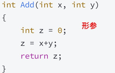 在函数名 Add 后的括号中写的 x 和 y ,称为形式参数,简称形参。