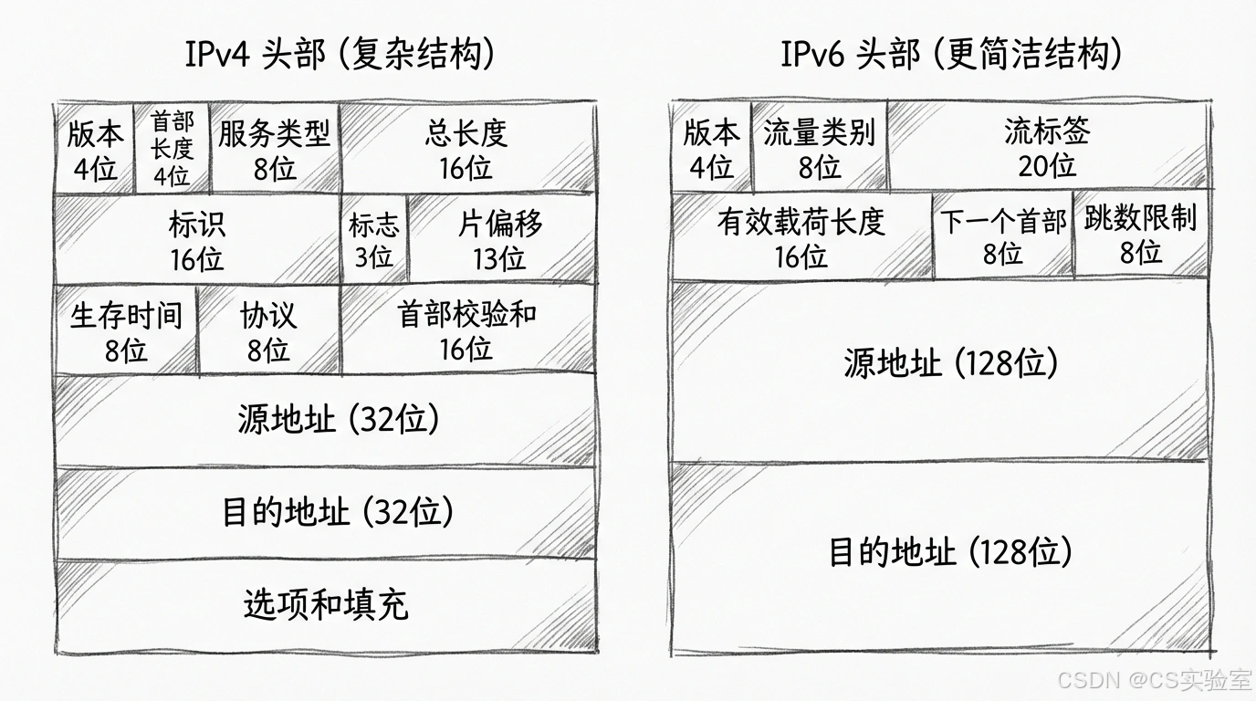 - 移除头部校验和:IPv6消除了校验和字段,因为错误检查由链路层和传输层协议处理。这减少了每个路由器的处理开销。