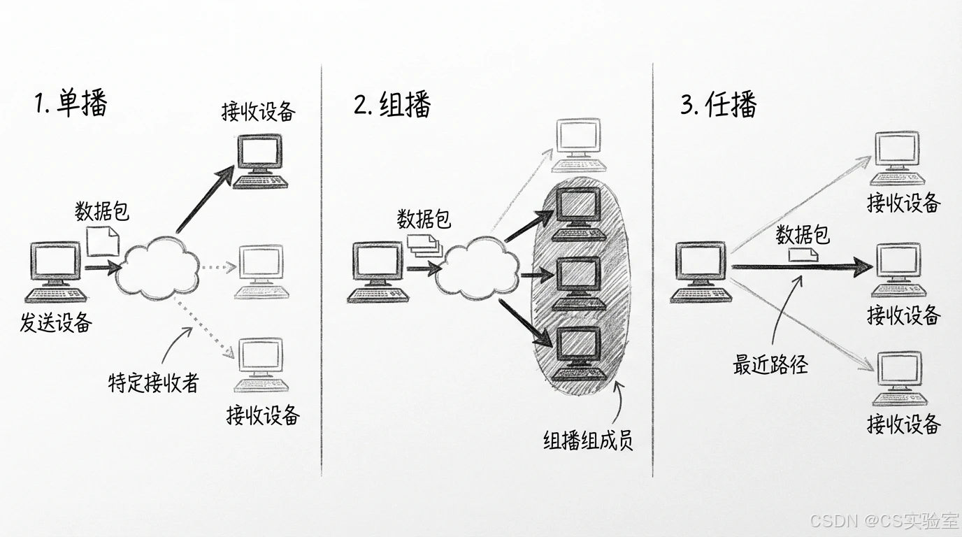 任播(Anycast):分配给多个接口,通常在不同设备上。发送到任播地址的数据包被路由到最近的实例(根据路由协议度量)。这对于负载均衡和冗余很有用。