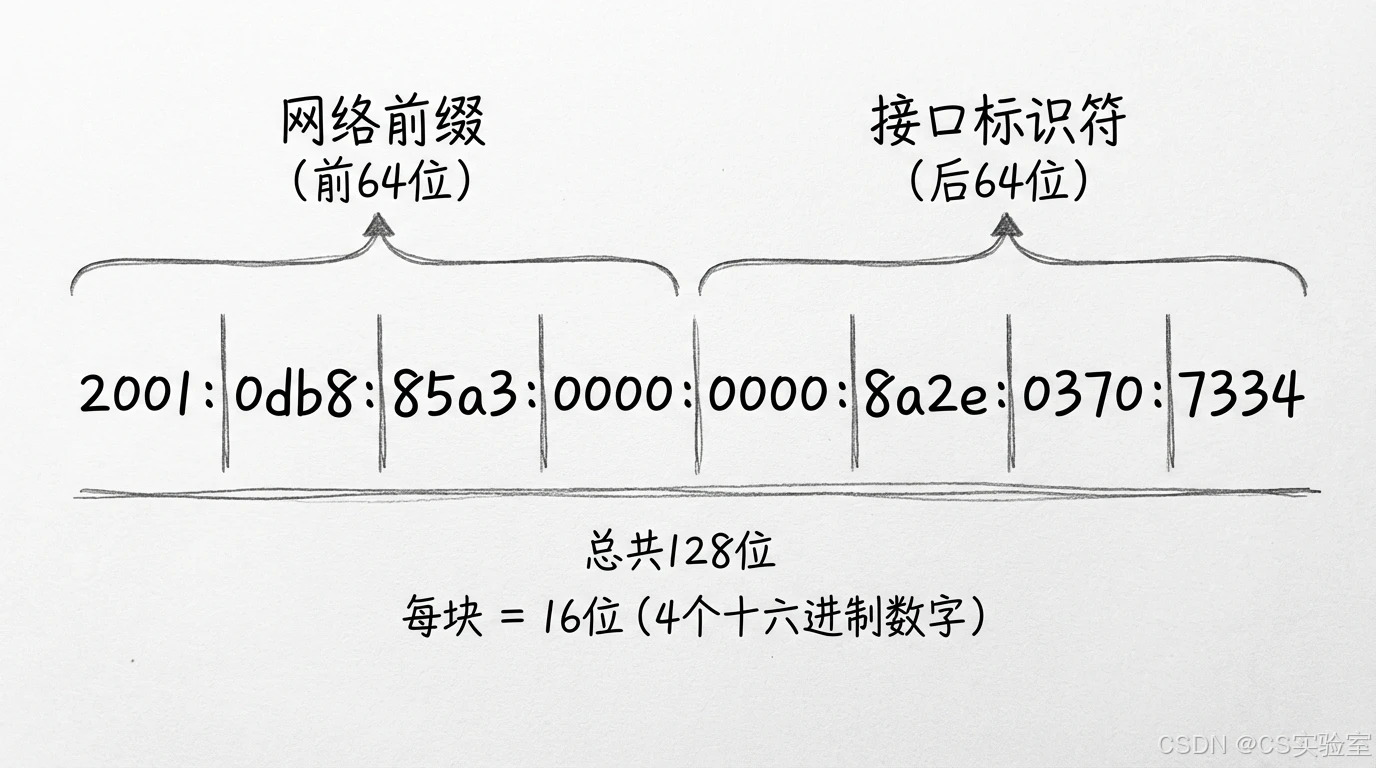 IPv6使用128位地址,提供2¹²⁸ ≈ 3.4 × 10³⁸个唯一地址------这个数字如此庞大,我们可以为地球表面的每平方米分配数十亿个地址。