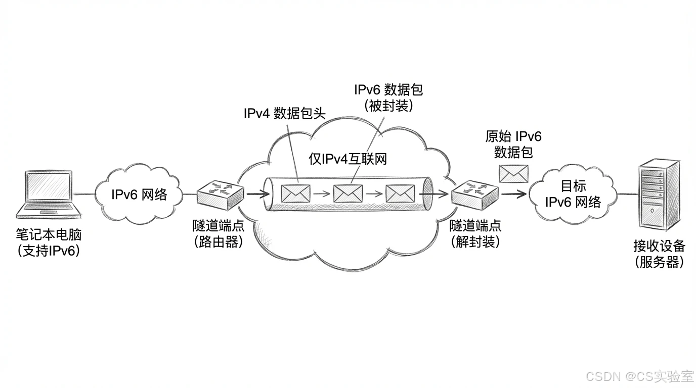 隧道将IPv6数据包封装在IPv4数据包中,允许IPv6流量穿越仅支持IPv4的网络: