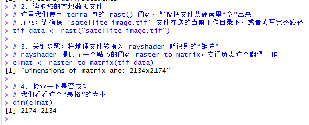 rayshader 并不直接分析 TIF 文件,它需要矩阵数据。因此,我们需要在 RStudio 中复制并粘贴运行以下代码: