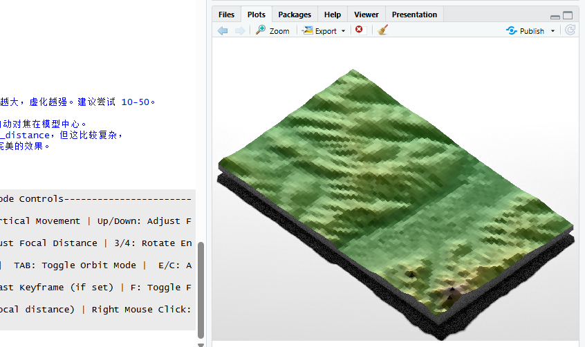 运行这段代码前,必须保持之前的预览 3D 窗口(RGL窗口)处于打开状态,并调整好最佳角度。运行代码后,R 会开始计算,可能需要几十秒,具体取决于电脑性能。复制并粘贴运行以下代码: