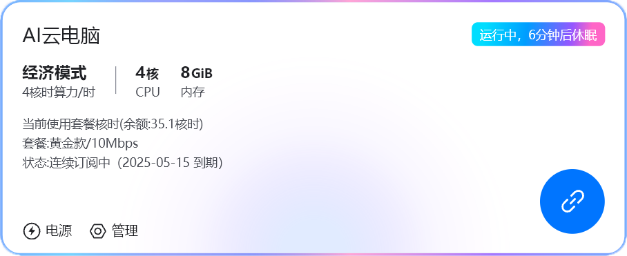 已获得的个人云电脑将会以卡片形式显示在小程序云电脑 页签的个人云电脑区域。你可以在云电脑卡片上执行关机、开机、重启、设置等操作。