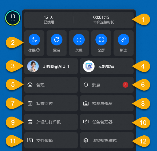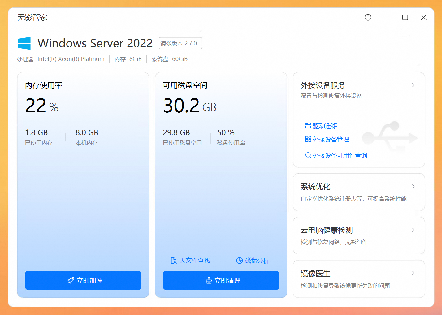 无影管家是云电脑内置的电脑管理应用程序,可以用来查看云电脑的基本信息、优化云电脑性能、管理外接设备、提交产品建议等。