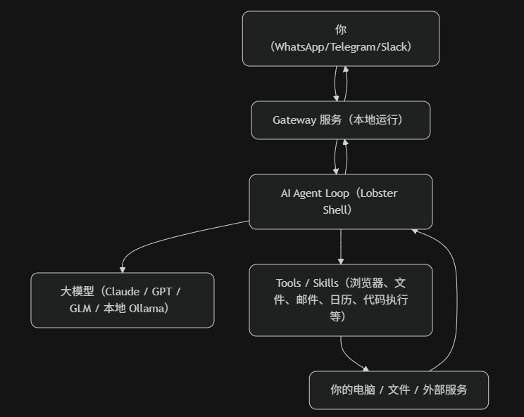 OpenClaw = 大模型推理内核(Claude/GPT/Ollama等) + Lobster智能执行循环 + 多渠道聊天网关 + 可插拔技能生态,目标是成为个人/小团队的24/7轻量「数字员工」。