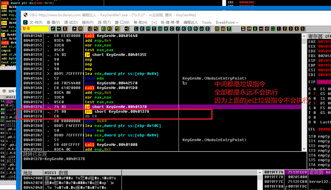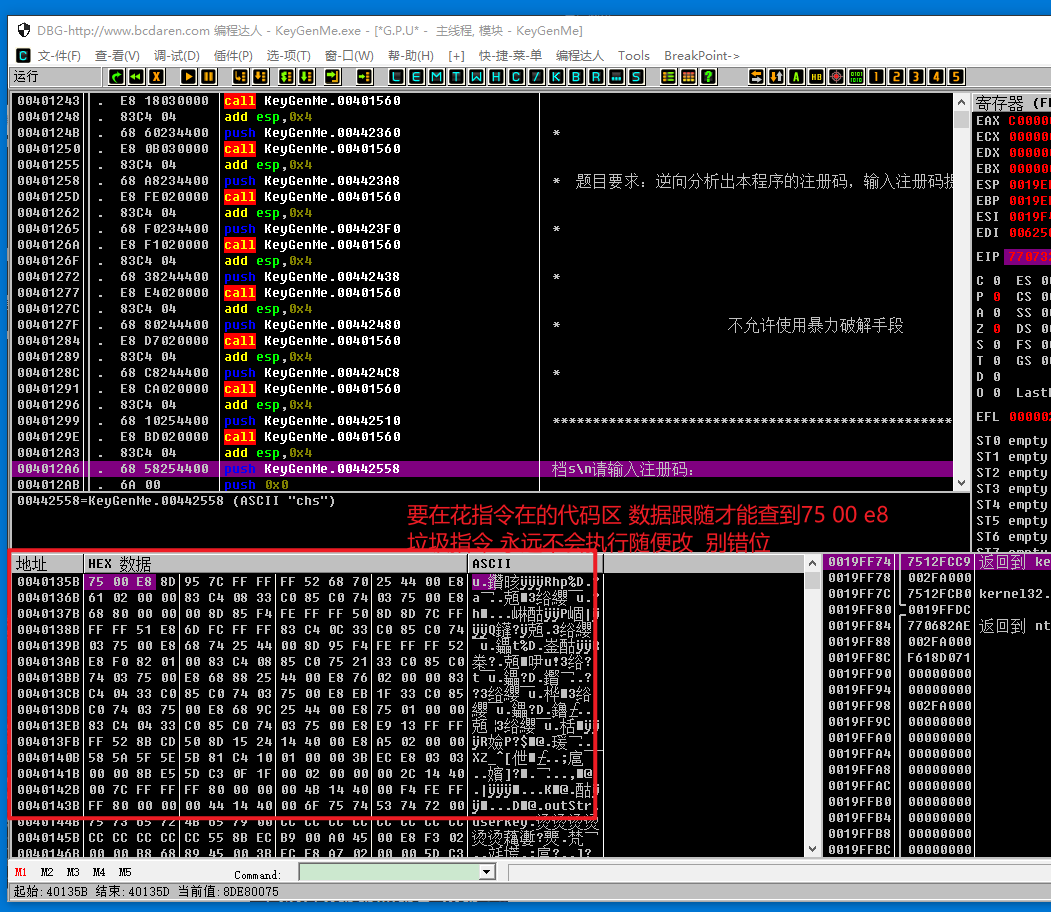 要在花指令在的代码区 数据跟随 才能查到75 00 e8 垃圾指令 永远不会执行随便改 别错位