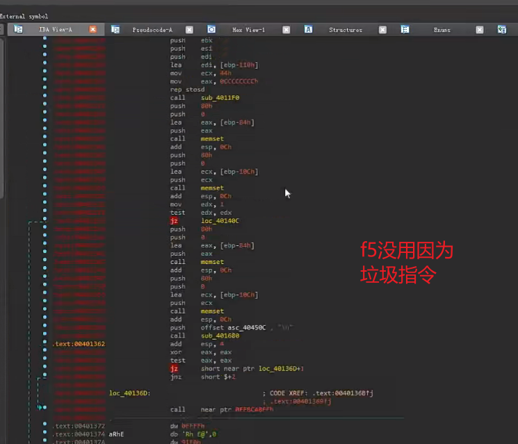 中间都是垃圾指令 全部都是永远不会执行 因为上面的je让垃圾指令不会执行