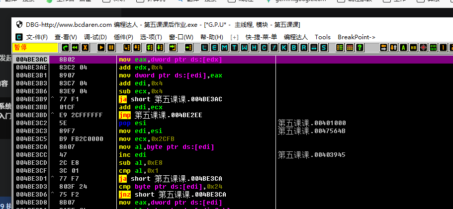通过ctrl + b 对于 75 00 e8 的内存【花指令特征】设置为909090 因为 垃圾指令不会运行 干扰错位