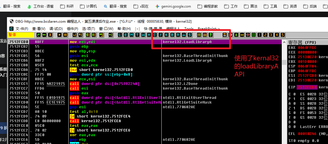 User32.dll或Kernel32.dll内部。 - 意义: 你需要按 Alt + F9 执行到用户代码,才能看到是哪个 Call 请求加载了这个字符串。