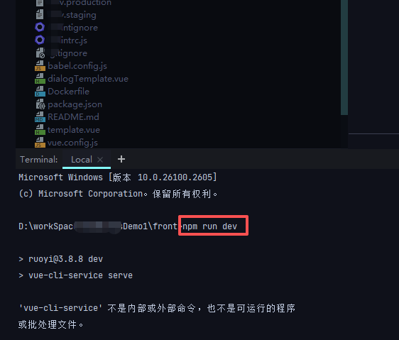 在启动若依 Vue 前端时执行npm run dev,报出vue-cli-service 不是内部或外部命令的错误,核心原因是项目的依赖包没有安装 / 安装不完整 ,导致找不到vue-cli-service这个核心执行命令,下面是解决方法: