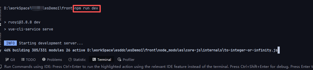 1、确保终端进入了若依前端的根目录 (目录里能看到package.json、node_modules(可能为空 / 缺失)、vue.config.js这些文件,若依前端默认目录一般是ruoyi-ui);