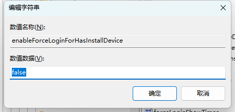 enableForceLoginForHasInstallDevice的字符串值。 - 双击该值,将其数值数据修改为