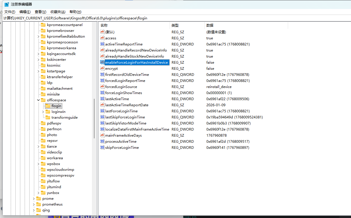 计算机\HKEY_CURRENT_USER\Software\Kingsoft\Office\6.0\plugins\officespace\flogin