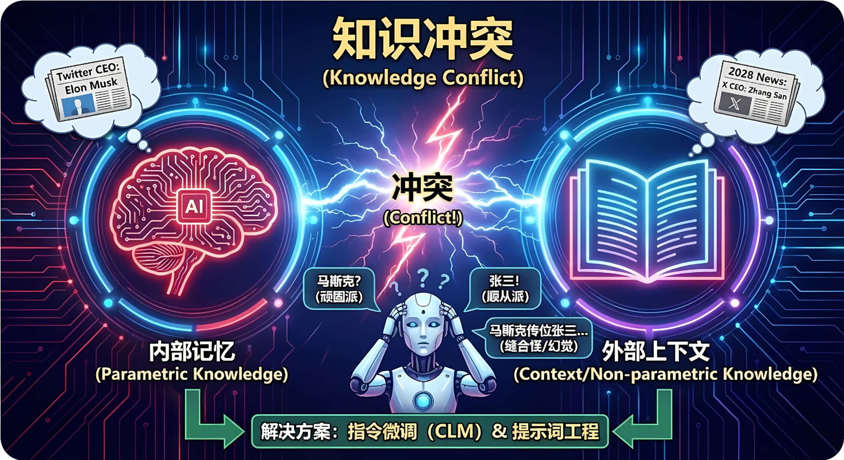当模型内部预训练的记忆(Parametric Knowledge)与外部提供的上下文信息(Contextual Knowledge)不一致,甚至是截然相反时,模型就会陷入"认知失调",不知道该信谁。