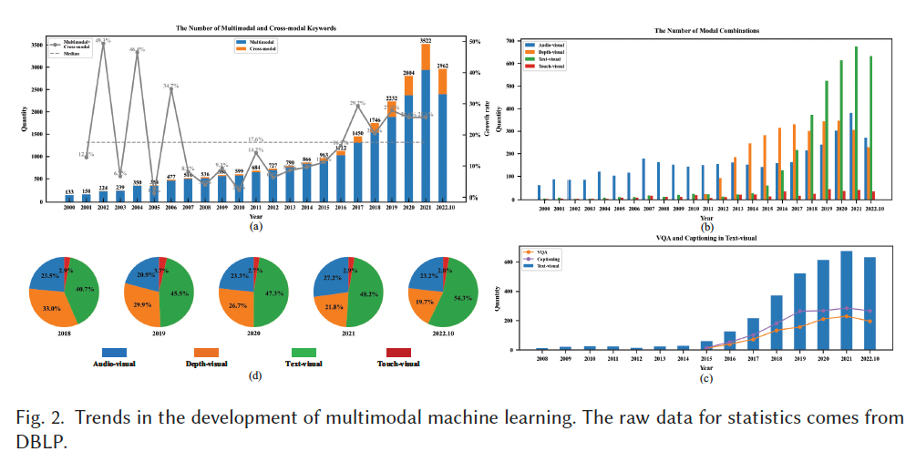 为了直观理解多模态学习的演进与模态组合的发展趋势,本文基于 DBLP 数据库中 2000--2022 年的统计数据(截至 2022 年 10 月)进行分析。通过对文献年份、类型与关键词的筛选,Figure 2 展示了多模态学习的 23 年发展趋势。