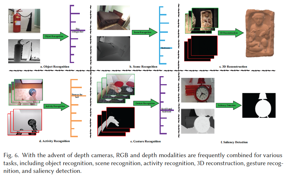 在第 2 节中,我们讨论了利用音频与视觉模态 进行活动识别的方法。本节将重点介绍RGB 与深度模态 在活动识别中的应用。在基于 RGB-D 的活动识别中,深度模态能够提供关键的三维结构信息 ,而 RGB 模态则提供丰富的纹理与颜色信息。两种模态之间的互补性可以显著提升活动识别性能。