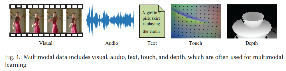 本文选取了五种常见模态:视觉(visual)、音频(audio)、文本(text)、触觉(touch)与深度(depth)(见 Figure 1),并从这些模态的不同组合出发,如 Audio-Visual、Text-Visual、Touch-Visual、Depth-Visual,系统梳理了多模态学习的主要研究方法与最新进展,帮助研究者全面理解各细分领域的研究现状。最后,本文还分析了当前多模态研究所面临的挑战,并对未来发展趋势进行了展望。此外,我们还在附录中整理了约 120 个多模态数据集,包含类别、规模、描述等详细信息,并提供了可访问与下载的链接。