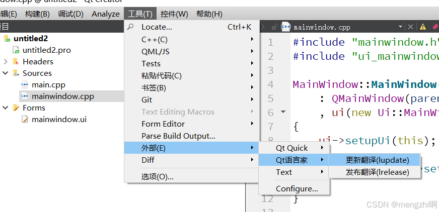 找到上面菜单栏的工具,点击工具,找到外部,再找到Qt语言家,点击更新翻译。然后在项目文件夹下会生成Chinese.ts和English.ts两个语言文件。