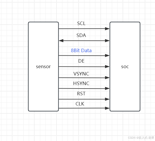 **不光sensor要准备好,soc这一侧也要准备好数据的接收。**相关的参数也需要告诉soc。比如,得到了分辨率信息,那么就需要把clk信息设置下去;中间根据frame长、宽的信息,配置一下行同步和场同步;开启stream之后,需要打开data enable;数据位配置的时候,需要告知soc,当前是8bit还是其他的,毕竟很多sensor还支持10bit、12bit。这样所有数据都配置ok之后,soc侧就可以接收数据了。