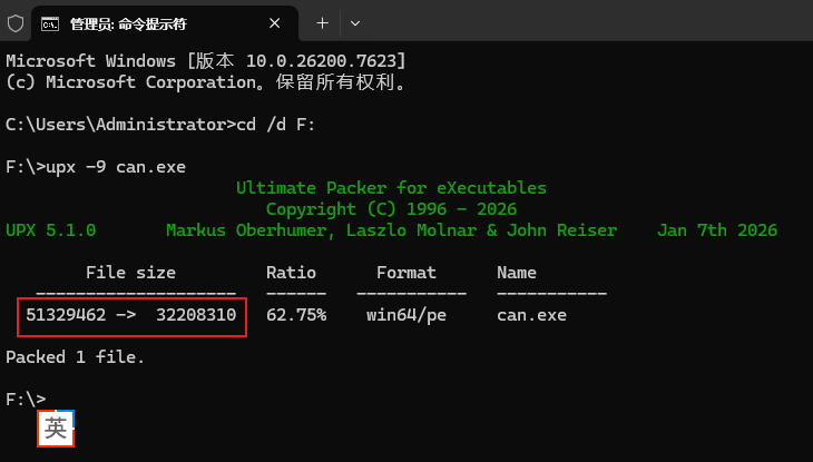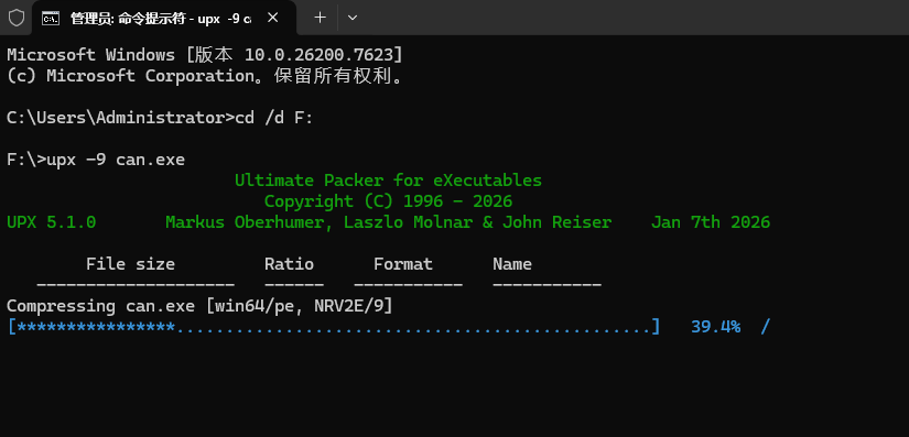重新以管理员方式打开命令行,之后使用CD命令切换到can.exe所在的文件夹,输入upx -9 can.exe进行进一步的压缩。如下图:
