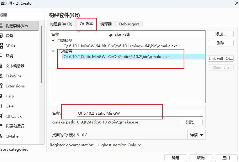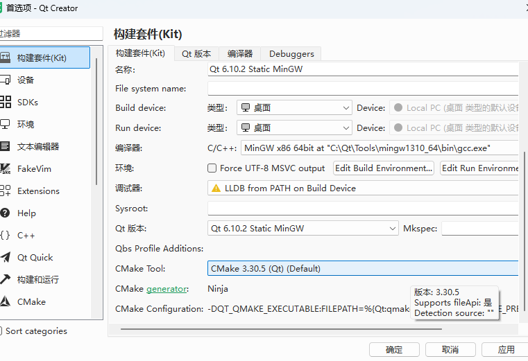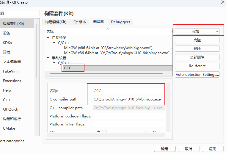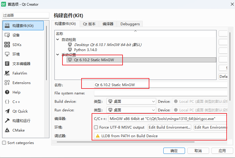 2,打开工程后,点击项目,管理构建套件,根据下图所示,一一选择或输入: