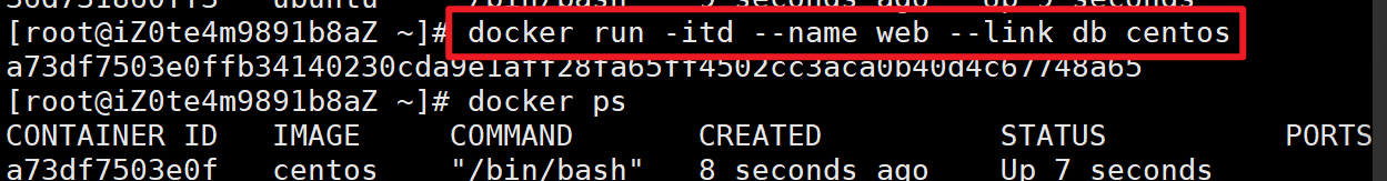 docker run -itd --name web --link db centos