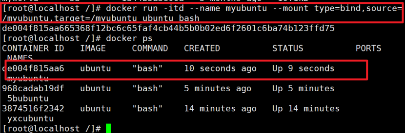 docker run -itd --name myubuntu --mount type=bind,source=/myubuntu,target=/myubuntu ubuntu bash