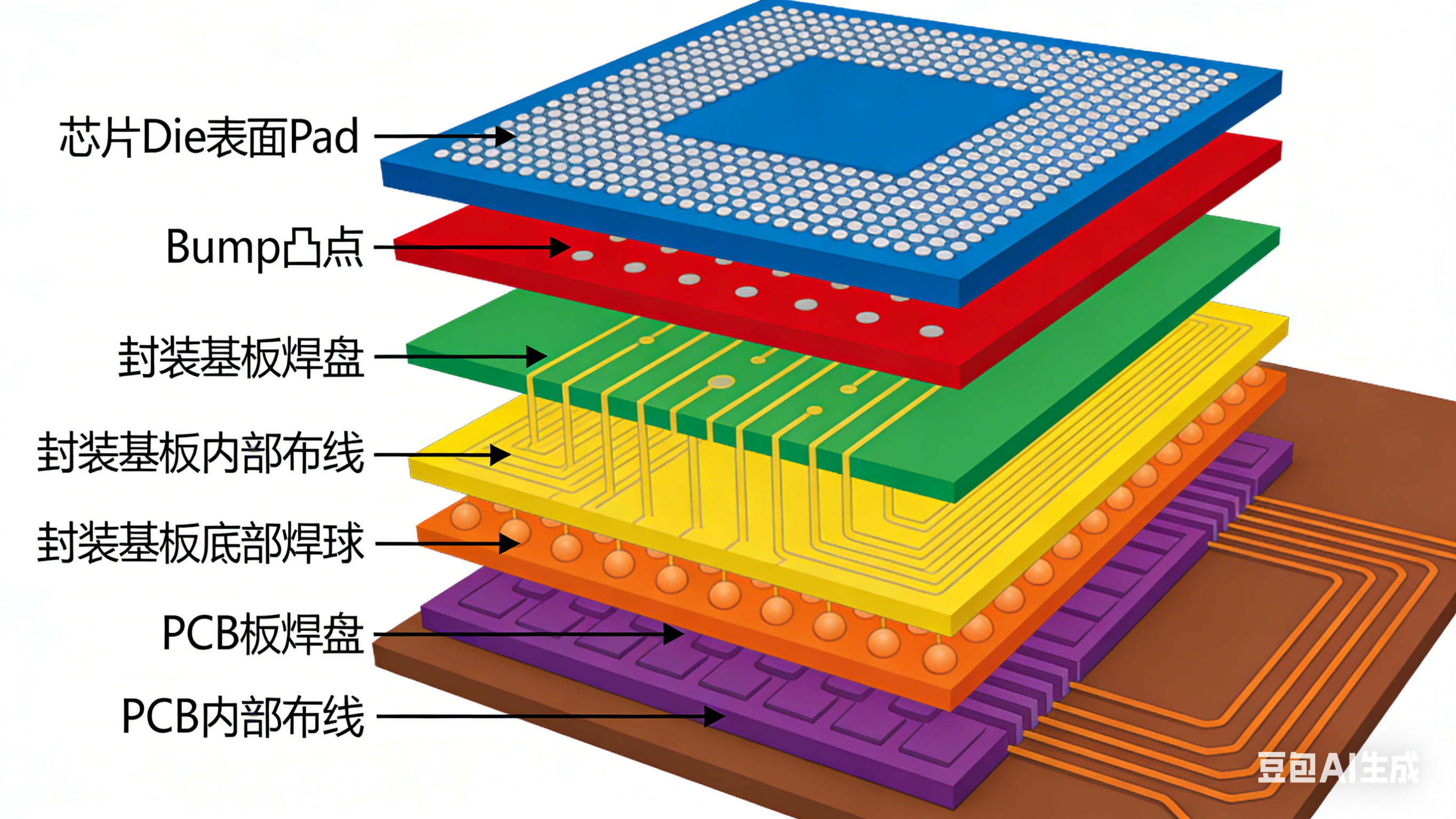 芯片 Die 内部电路 → 芯片表面 Pad(焊盘) → Pad 上制作 Bump(凸块) → 封装基板的基板焊盘(回流焊连接 bump)→ 封装基板内部微布线(扇出 + 阻抗匹配)→ 封装基板底部焊球 / 引脚 → PCB 板的元器件焊盘 → PCB 板内部布线 → 其他元器件 / 外部接口