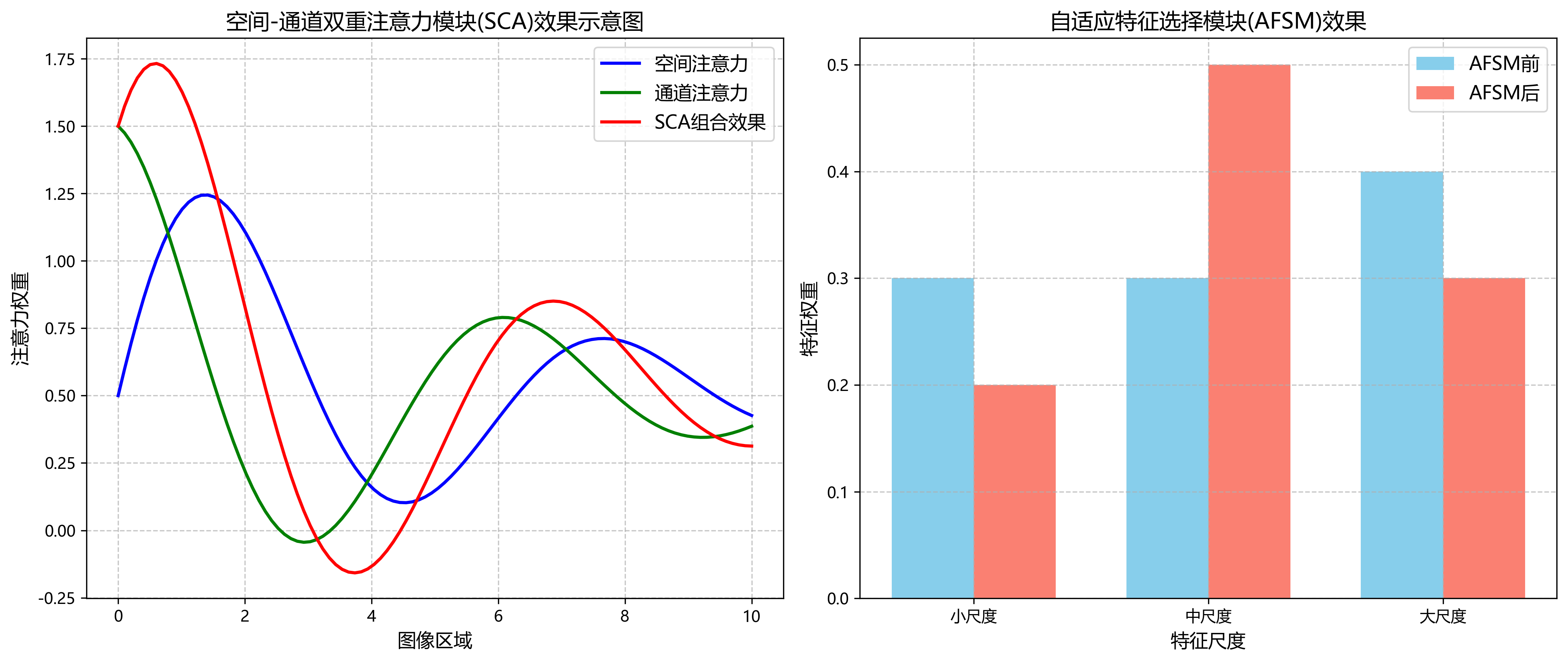 为了进一步提升模型对入室盗窃行为的识别能力,YOLO11-MAN-Faster在多个阶段引入了注意力机制。首先,在基础网络中引入了空间-通道双重注意力模块(SCA),该模块同时建模空间位置和通道间的关系,使模型能够关注图像中与入室盗窃相关的区域。其次,在特征融合阶段引入了自适应特征选择模块(AFSM),该模块根据不同尺度的特征重要性,动态调整特征融合权重。