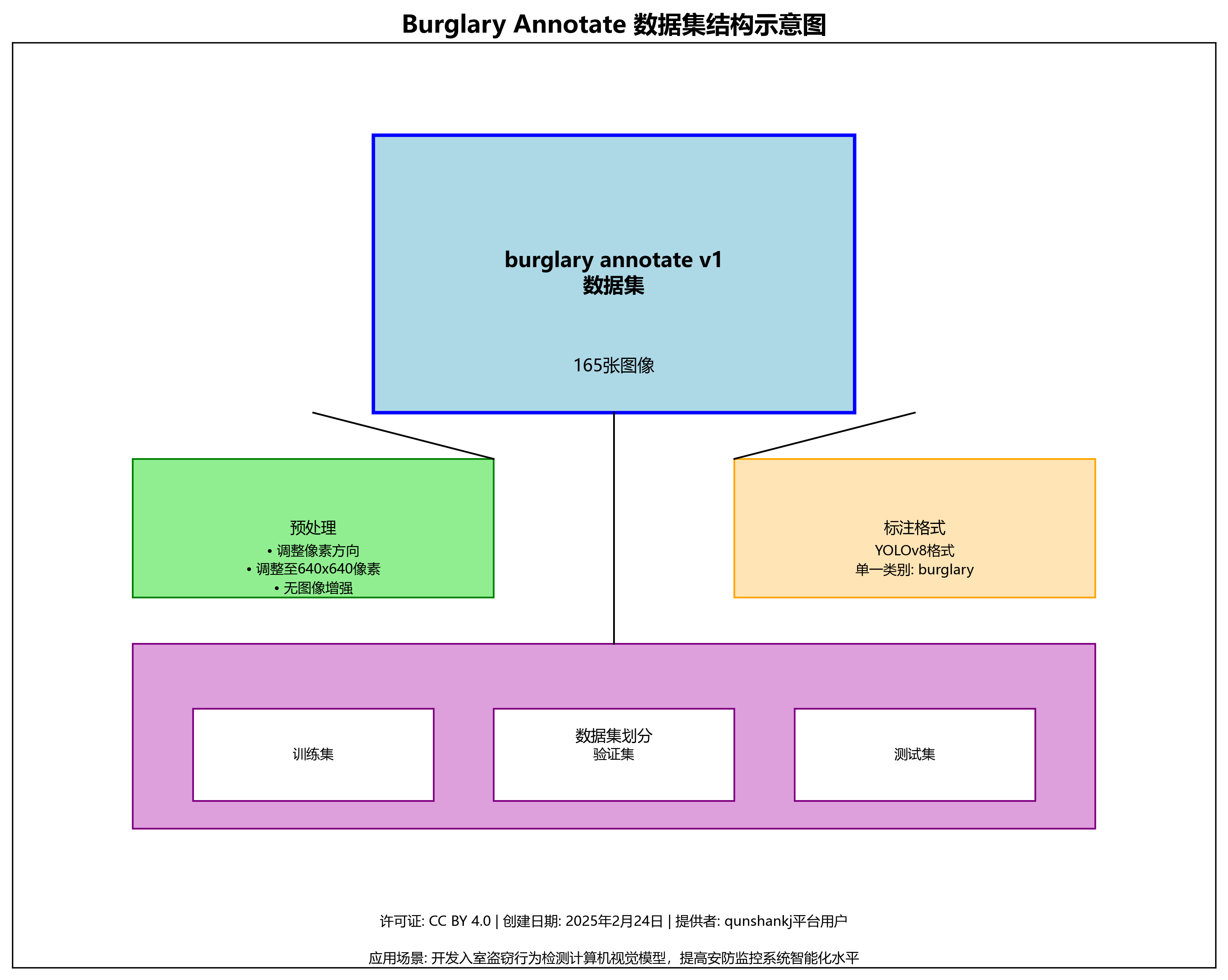 本数据集名为"burglary annotate",版本为v1,创建于2025年2月24日,由qunshankj平台用户提供,采用CC BY 4.0许可证授权。该数据集包含165张图像,所有图像均已进行预处理,包括自动调整像素方向(剥离EXIF方向信息)并拉伸调整至640x640像素尺寸,但未应用任何图像增强技术。数据集采用YOLOv8格式进行标注,专注于入室盗窃(burglary)这一单一类别的目标检测任务。数据集已划分为训练集、验证集和测试集三个子集,便于模型的训练、验证和测试。该数据集可用于开发能够自动识别和检测入室盗窃行为的计算机视觉模型,有助于提高安防监控系统的智能化水平,为公共安全提供技术支持。