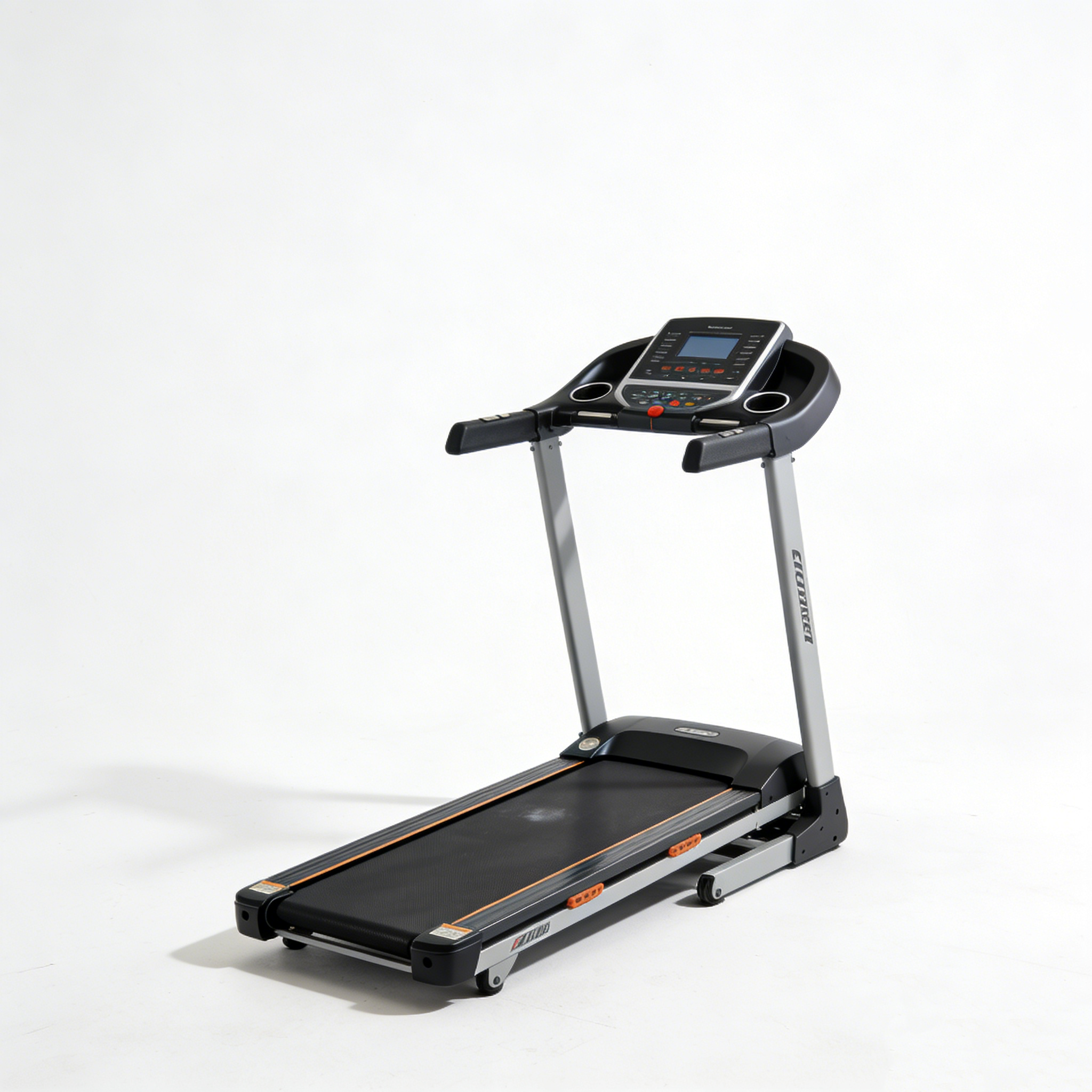 原图:家用跑步机白底实拍图(全身全景,清晰拍出跑步机机身、操作面板、跑带细节,无反光、无阴影、无多余杂物),重点突出机身设计和整体版型。