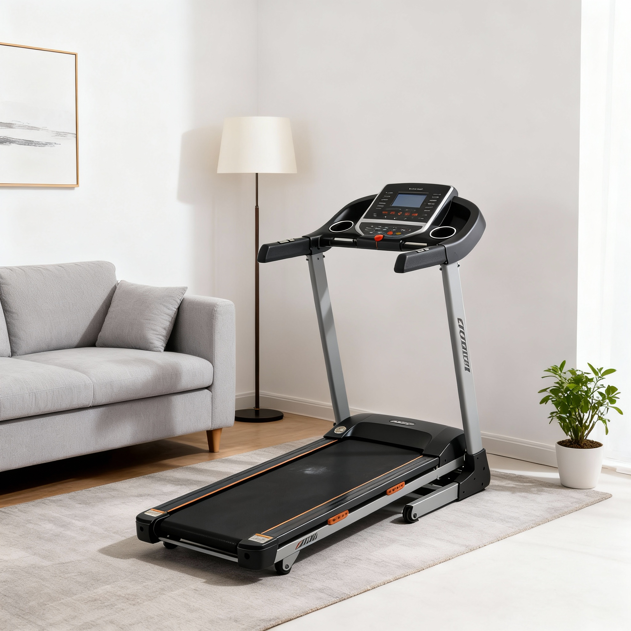"高端家用跑步机,机身线条清晰,放置在现代简约客厅角落,搭配浅灰色沙发、落地灯、简约挂画、小型绿植。"