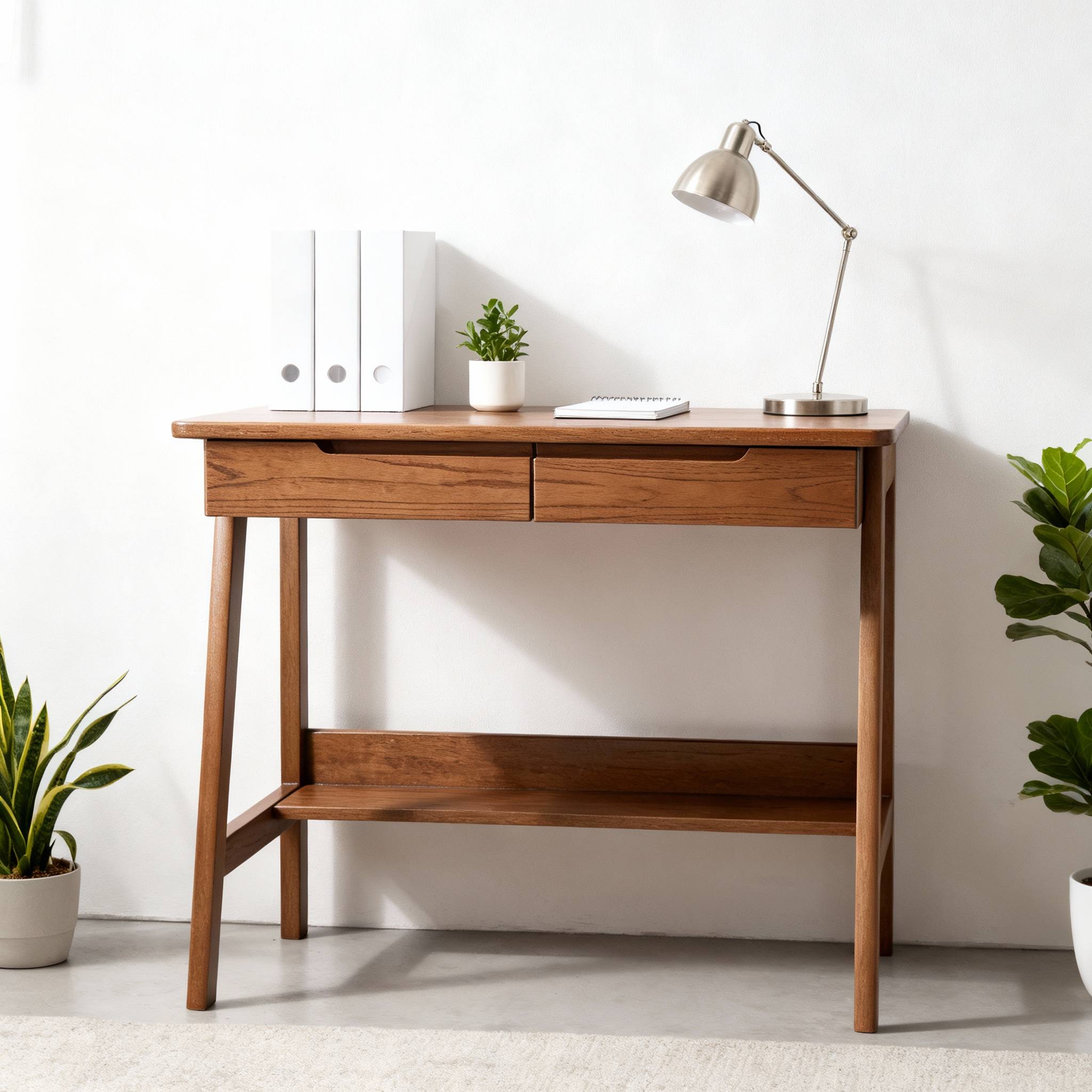 "高端实木书桌,纹理清晰,放置在简约ins风书房,搭配白色书立、金属台灯、绿植盆栽、简约笔记本。"