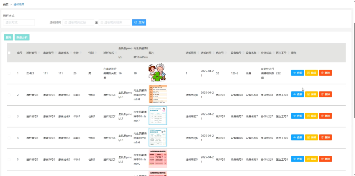 诊疗相关功能:查看、分析患者透析结果,评估治疗效果并调整治疗方案;查看、编辑、删除患者病情预测信息,为患者提供精准医疗建议。