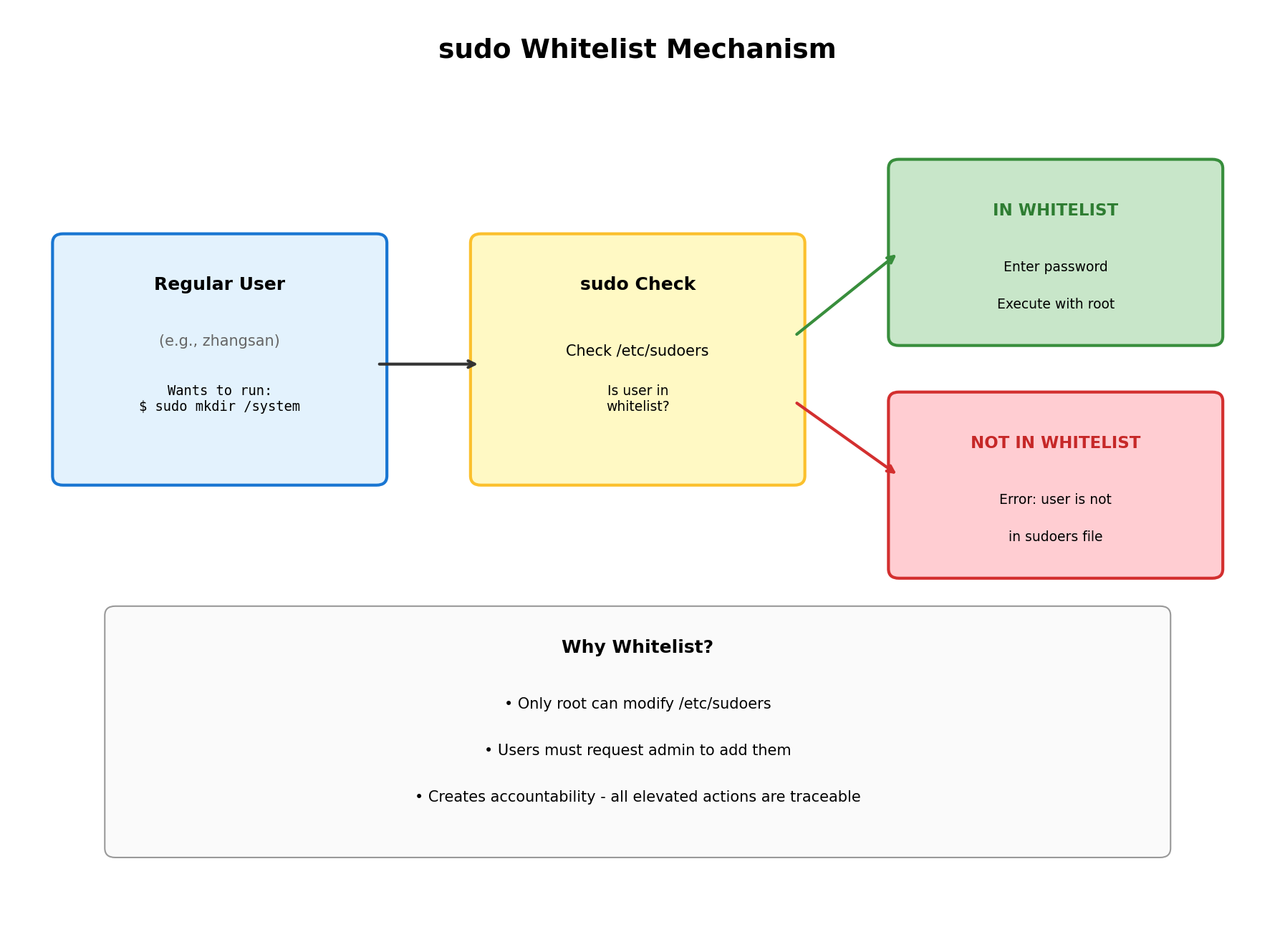 这种设计的精妙之处在于可追溯性。假设一台服务器上有10个用户,其中只有3个在白名单中。如果某天服务器出现了问题,管理员首先会检查这3个有sudo权限的用户的历史操作记录。这样既保证了必要的灵活性,又确保了安全性------你无法偷偷做坏事而不被发现。