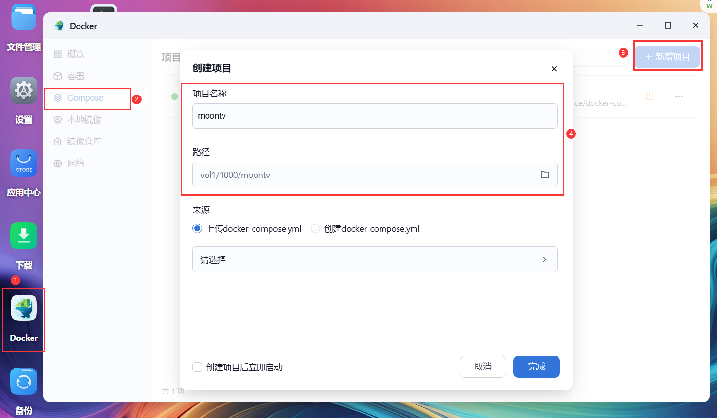 3,如下图,在 Docker 的 Compose 里面新建项目,项目名称可以自定义,路径是刚才新建文件的路径。