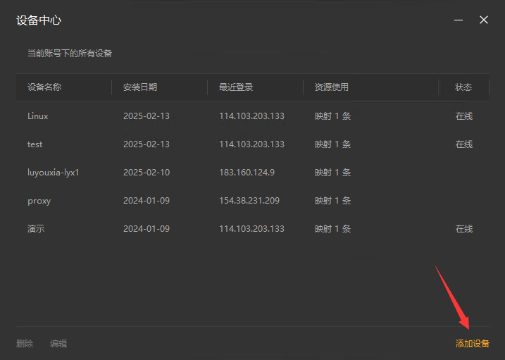2,在 Windows 机器上的路由侠客户端主界面,进入"设备中心",点击右下角的"添加设备",此时可查看到对应的安装码,此安装码用于将设备添加到对应账号下,可选中后复制。