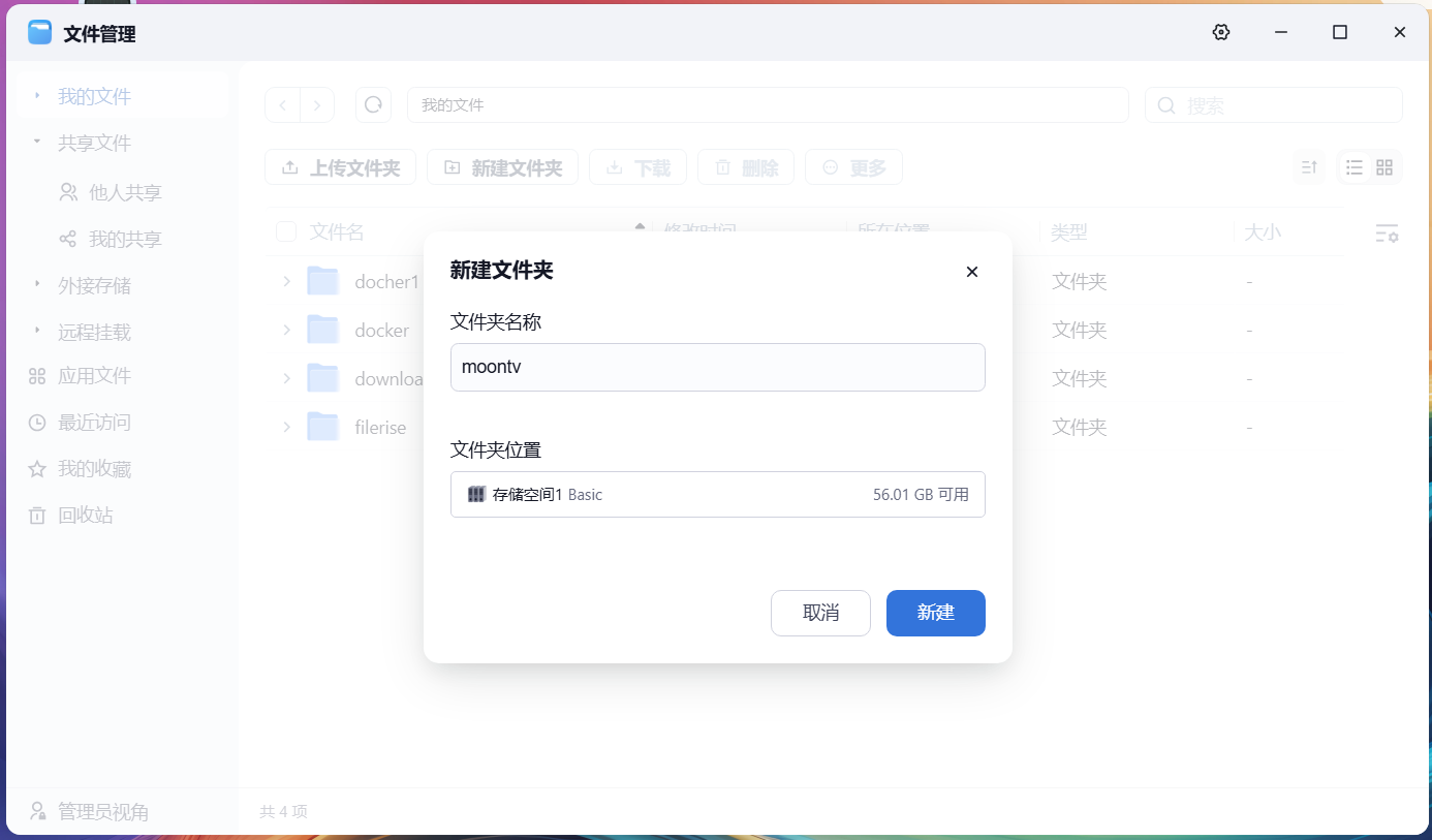 2,打开飞牛,在文件管理里面新建 moontv 文件夹。